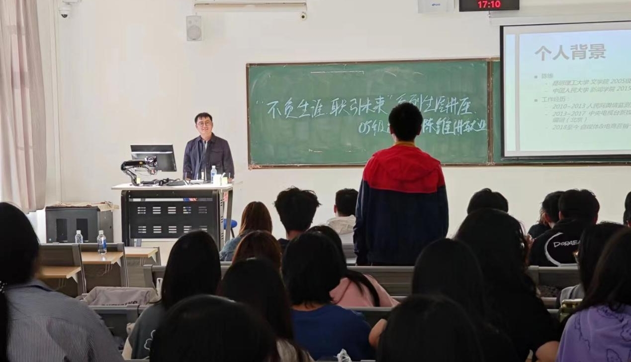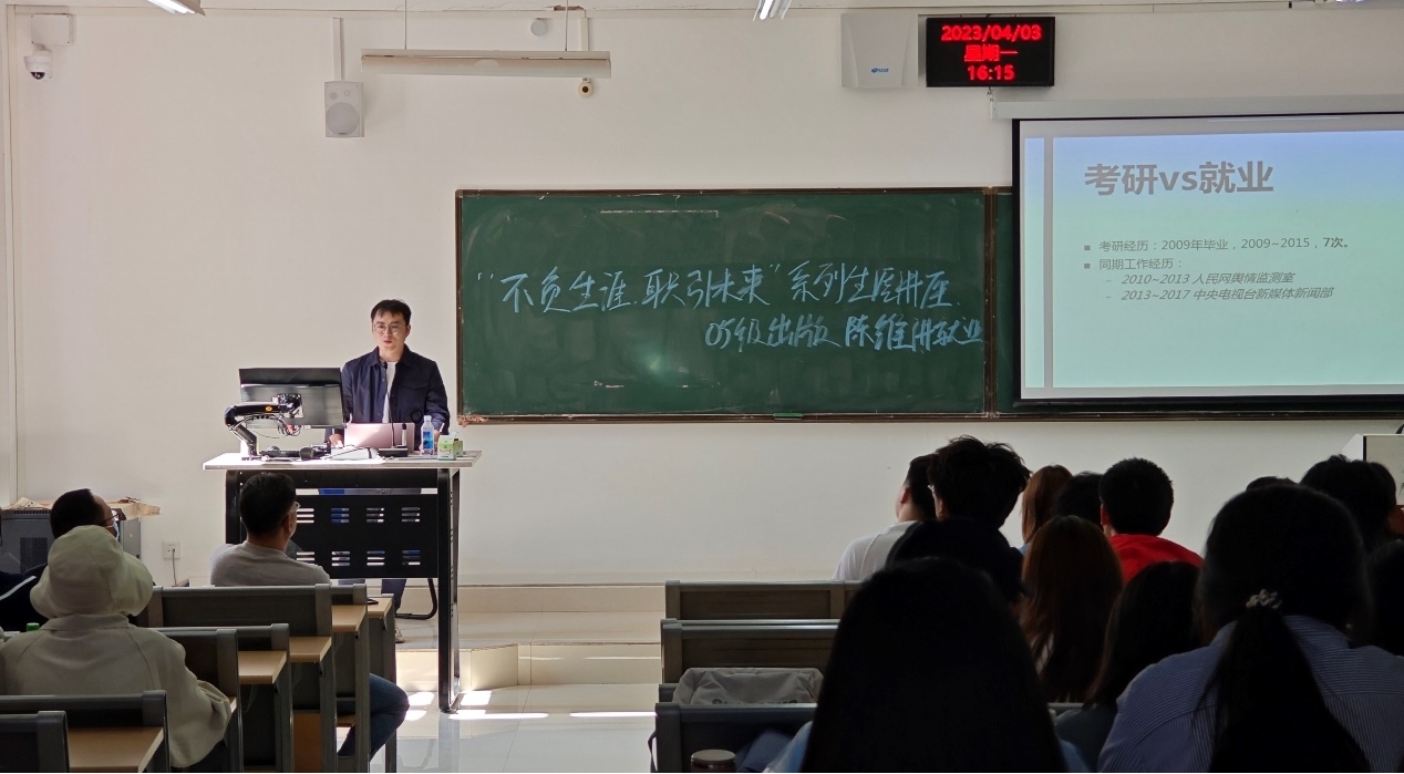 2009届编辑出版学校友陈维回院以“毕业路口的抉择”为主题与师弟师妹们分享职业规划心得,传播学、广告学和广播电视专业学生百余人参加了此次讲座。