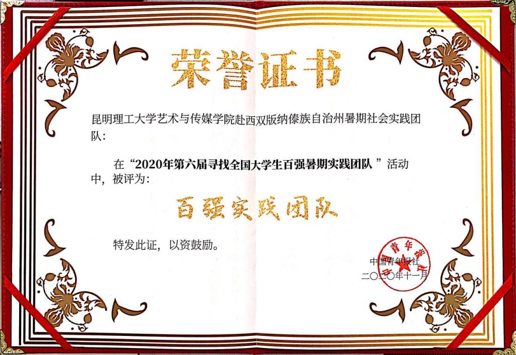 赴西双版纳傣族自治州暑期社会实践团队从1500余支入围队伍中脱颖而出,荣获“全国百强实践团队”称号。
