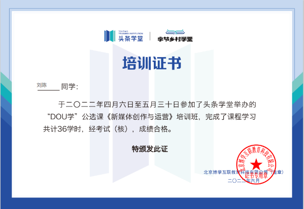 2019级广告班的同学成功通过课程学习、实操演练及考试考核,共计33名同学考试合格,并获得头条学堂颁发的电子结业证书。参与此次培训的12080名同学中有33名同学脱颖而出获得闪光学生称号,其中,糖心视频