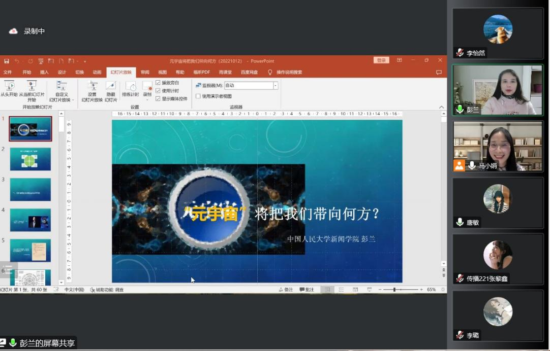 讲座开始,彭兰教授首先提醒大家,对于热点研究话题要保持审慎的态度。接着,彭兰教授从元宇宙概述及传媒业的应用可能、元宇宙争夺用户有限的生理带宽、社交连接的重负、数字化身与认同及沉浸式体验五个部分展开讲座内容。