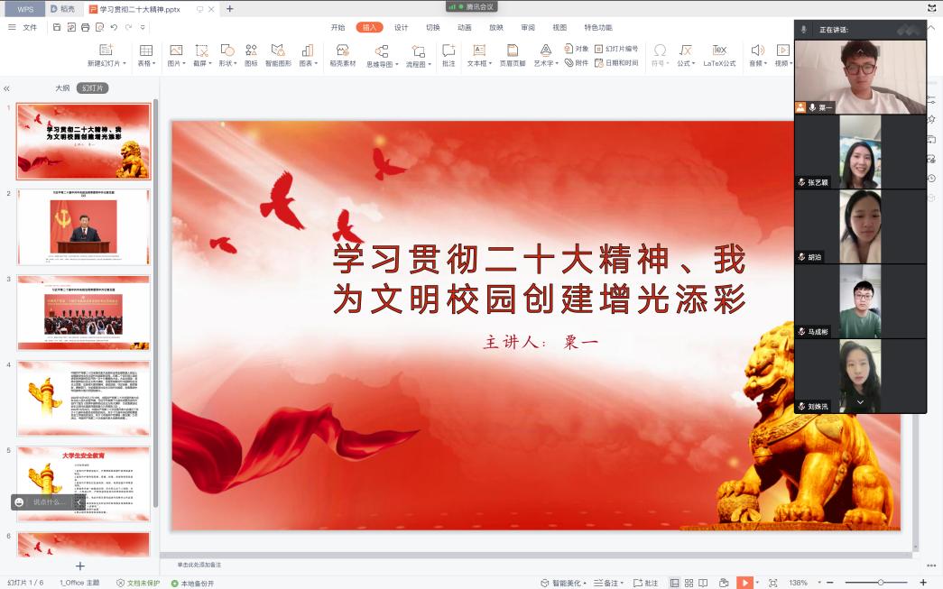 全体研究生根据各班学生实际在校情况,通过线上与线下相结合的方式开展了“学习贯彻二十大精神、我为文明校园创建增光添彩”主题班会。各班还集中学习了二十届一中全会、习近平总书记在二十届中共中央政治局常委同中外记者见面时的重要讲话、党的二十大报告和习近平总书记在党的二十大闭幕时的重要讲话精神。学院还通过组织学生观看红色影片、组织学习党史演讲比赛等多种方式活学活用,深刻领会二十大精神。