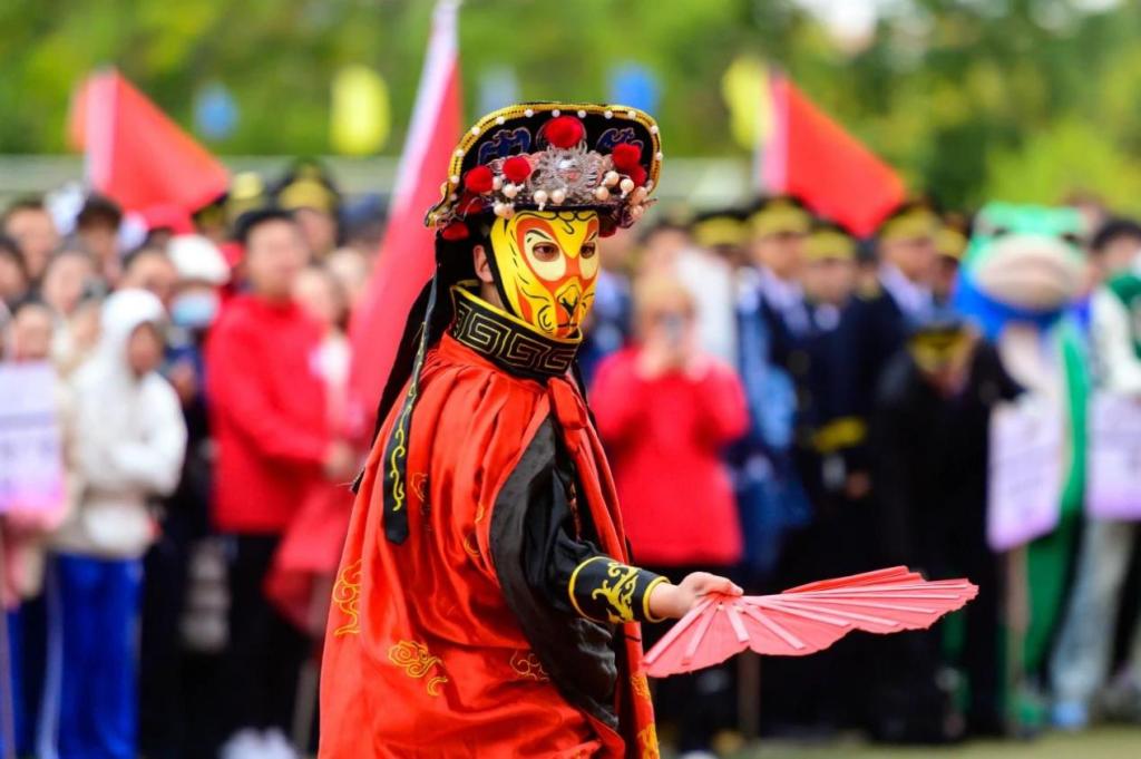 艺传院方阵的席鸿武同学表演了川剧变脸及喷火特技。川剧是传统戏曲剧种之一,川剧变脸是川剧表演的特技之一,川剧变脸是运用在川剧艺术中塑造人物的一种特技。喷火也称吹火,秦腔绝技,表演者可以从嘴中喷出火来,其重要性有如变脸之于川剧。