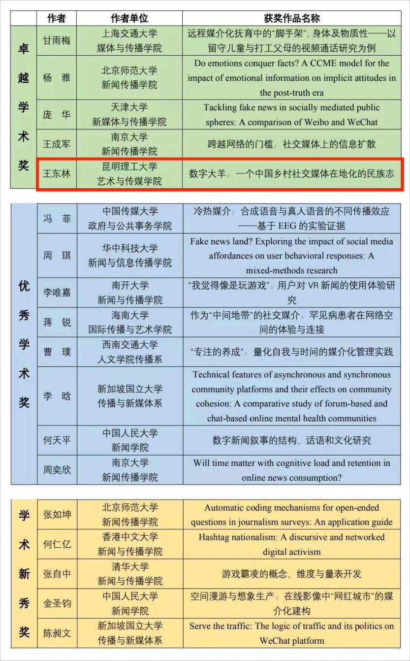 王东林副教授的著作《数字大羊:一个中国乡村社交媒体在地化的民族志》获得第五届青年新媒体学术研究“启皓奖”卓越学术奖。