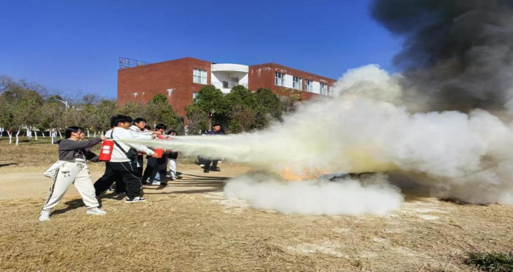 “纸上得来终觉浅,绝知此事要躬行。”讲座尾声,参讲师生共同前往学校保卫科前空地进行灭火实操。在‘“提”“拔”“握”“压”’灭火口诀指引下,实操过程紧张有序,参讲师生各司其职,成功扑灭火源。