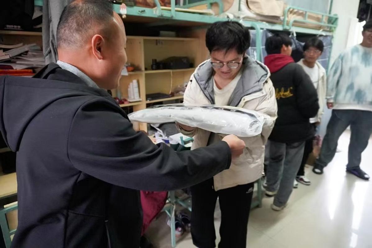 20日下午,学院领导及老师们前往学生宿舍,为同学们送上了精心准备的御寒冲锋衣。每到一个宿舍,老师们都与学生亲切交流,详细了解大家的学业情况与生活状况,叮嘱同学们注意防寒保暖,合理安排期末学习计划。