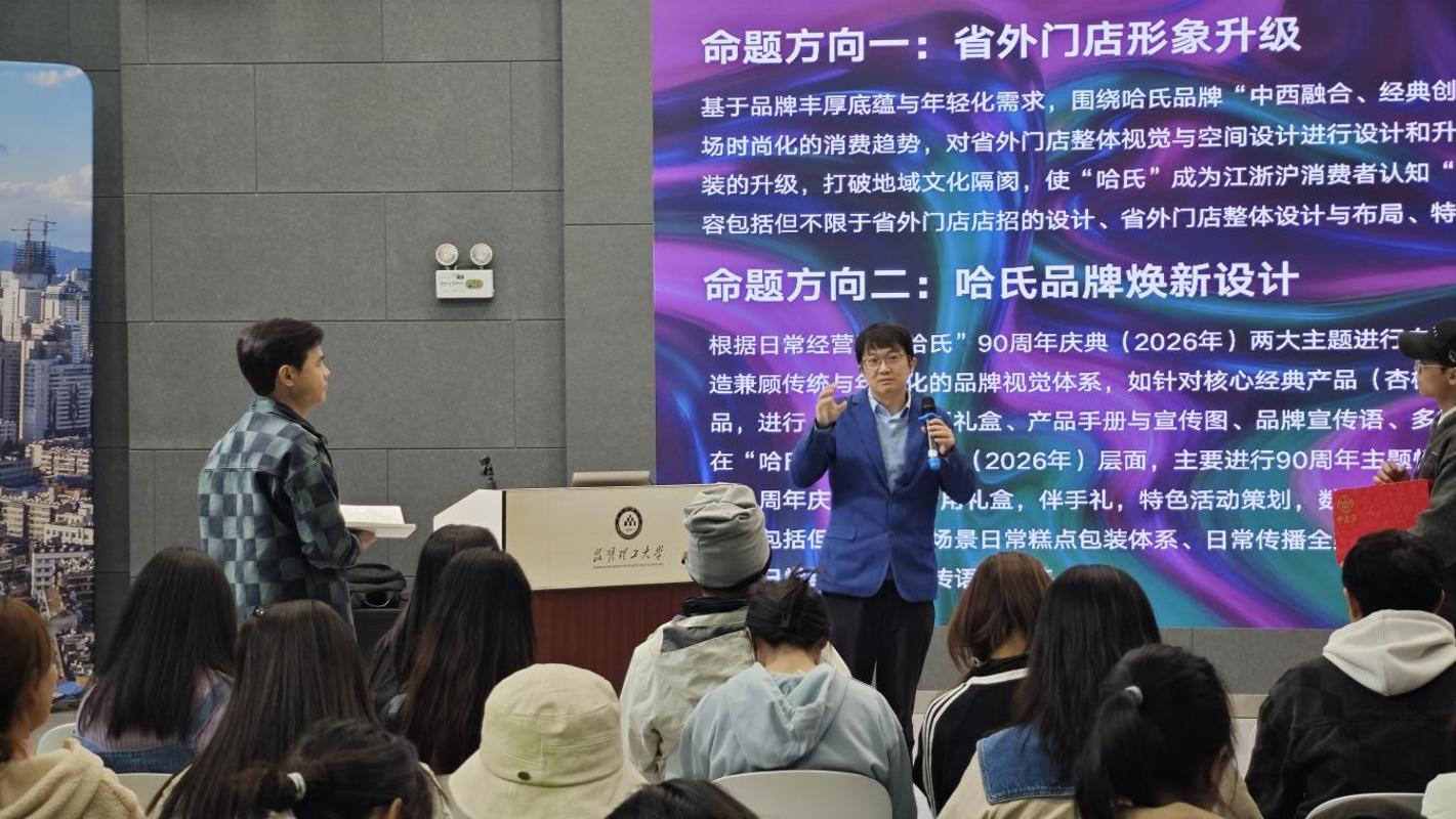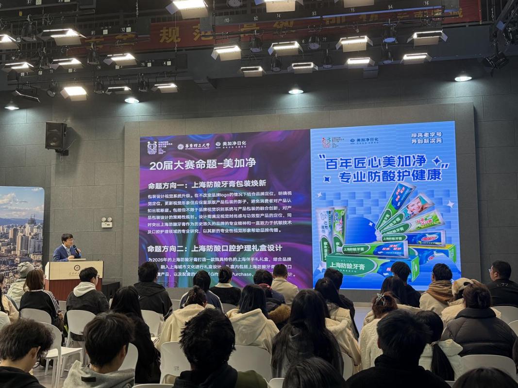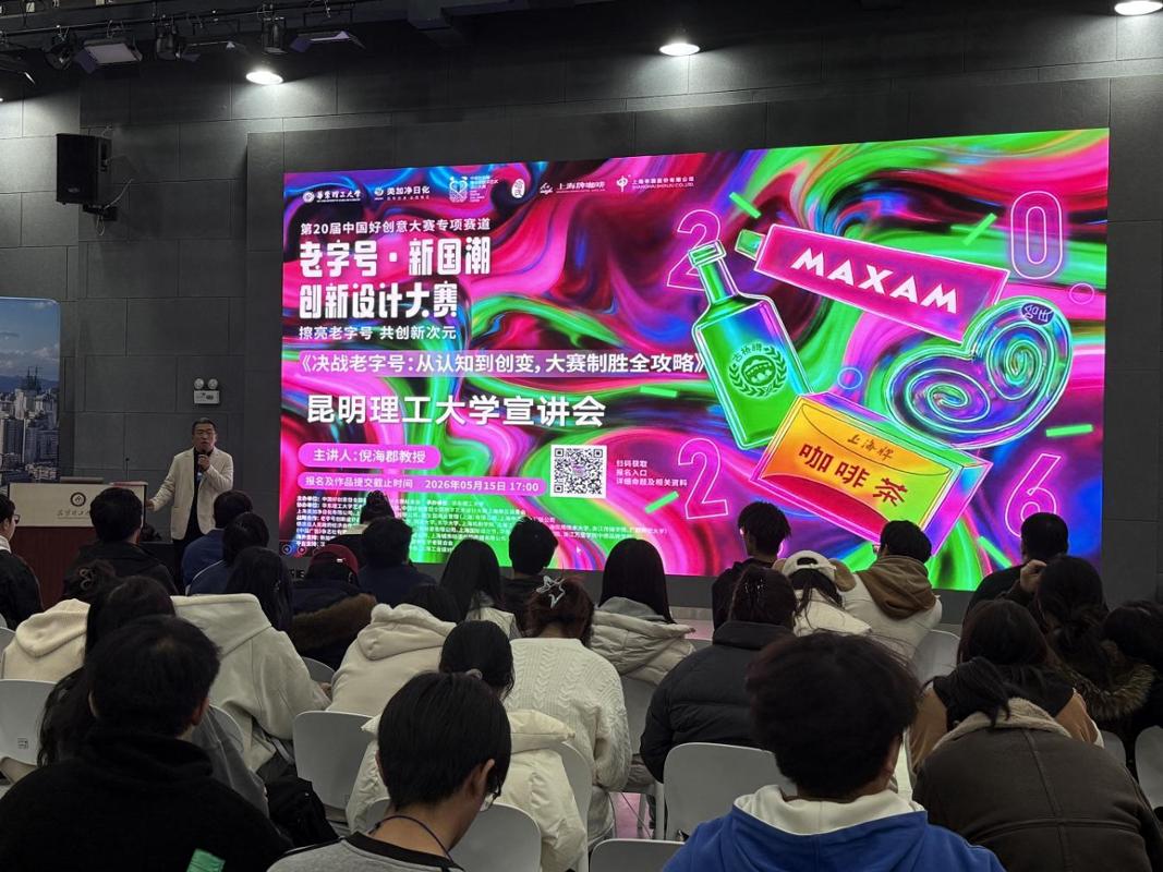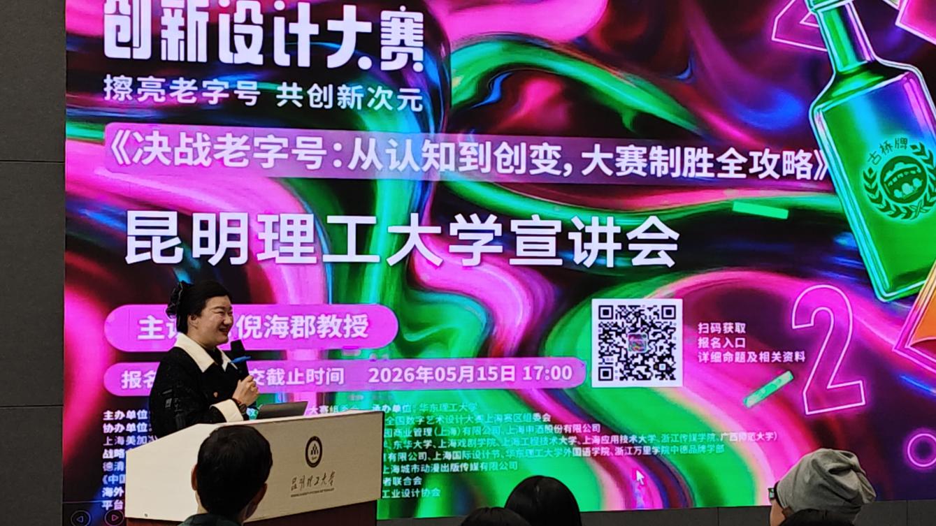 随后 院倪海郡教授进行了“老字号·新国潮”赛事专题宣讲,系统梳理大赛宗旨、赛道设置与评审标准,对往届优秀获奖作品进行逐一点评与创作复盘,从策略洞察、视觉转化、文化叙事到商业落地,为在场师生呈现了一场“国潮”设计公开课。