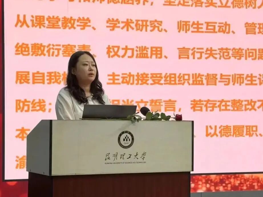 新教师代表徐嘉怿作表态发言,而后庄严宣誓,承诺将 “四有” 好老师标准落到实处,始终坚守育人初心。